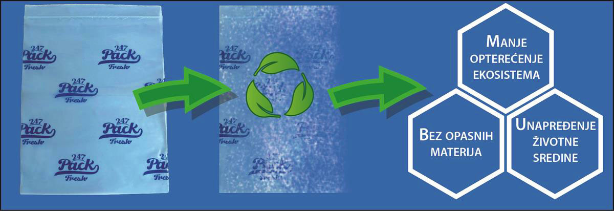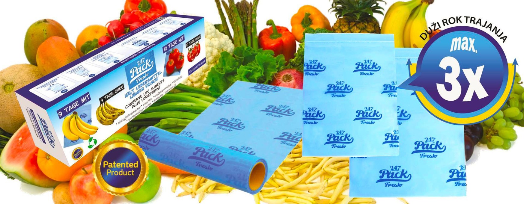 Zahvaljujući posebnom prirodnom premazu unutar vrećica za svježinu, etilenski plinovi se apsorbiraju, što usporava proces kvarenja i time produžuje rok trajanja do 3 puta.